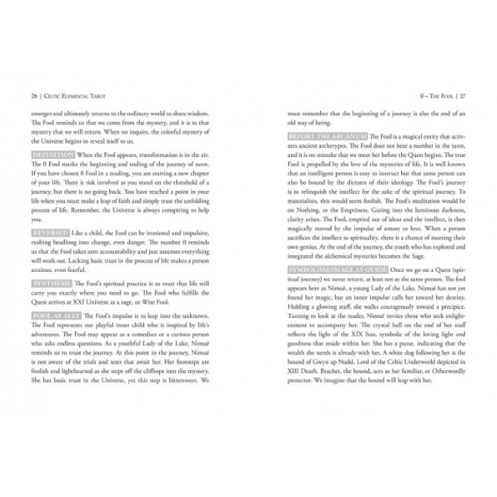 • Presents the Major Arcana cards as allies, challenges, virtues, and cosmic forces, while the elemental Minor Arcana offers court cards featuring characters of Arthurian and Grail lore