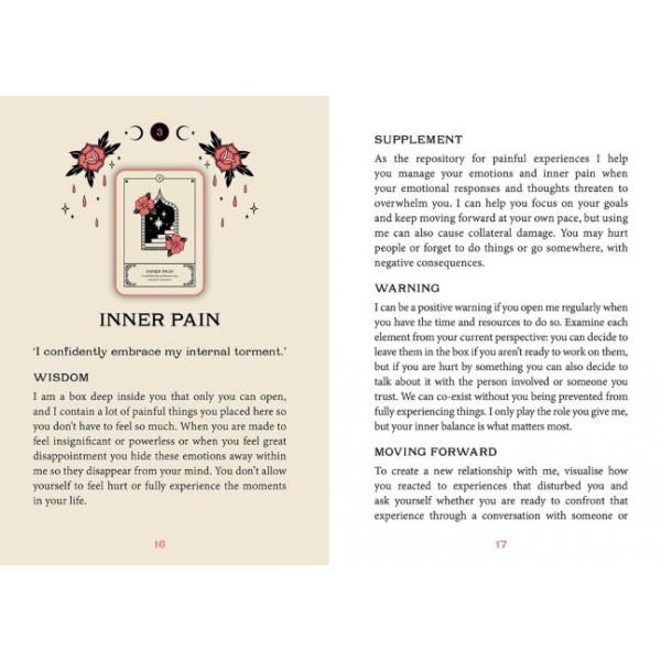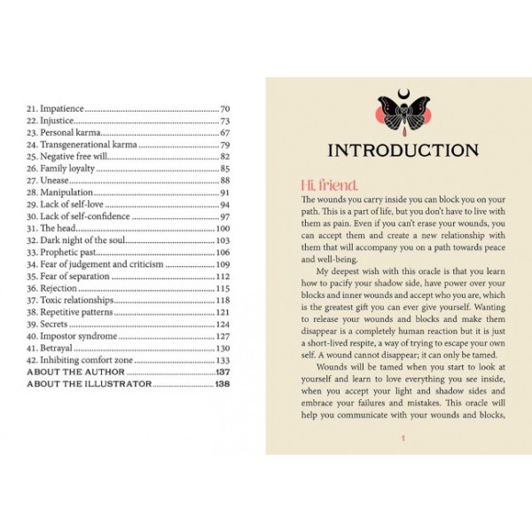 We all carry soul wounds and the blocks our unconsciousness created to protect us. By learning to accept your inner wounds, you will be able to deconstruct the blocks that weigh you down and accept yourself at your deepest level: this is the greatest gift you can give yourself. This 42-card oracle illustrated by Daphna Sebbane will help you to receive messages from your traumatised self and become aware of your deepest needs and desires. Through this work, your wounds and blocks will turn into positive energy. Allow yourself to love all the complex layers of who you are and reveal your inner magic.