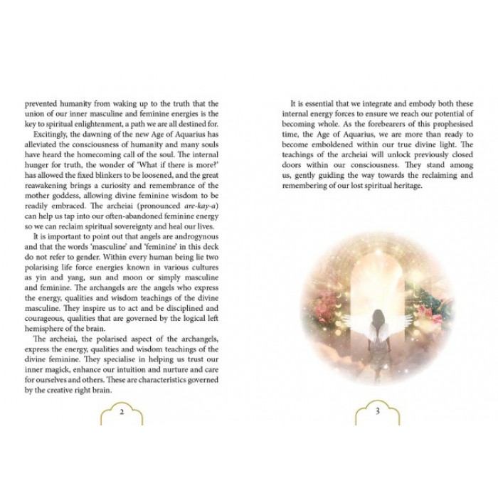 The 44 cards in this deck are comprised of 13 Master Angel cards and 31 Angelic Wisdom teaching cards. Each master card represents one of the 13 Archeiai. Pulling one of these cards suggests that the chosen angel is drawing your awareness to her presence. See this as an invitation to invoke her powerful healing light. The 31 angelic wisdom teaching cards offer direct insight into the circumstance that you are inquiring about. They offer you guidance for your soul's highest good. By accepting the angel's wisdom teachings, you will receive far more than a message; you will learn to ignite the Divine Feminine within yourself.