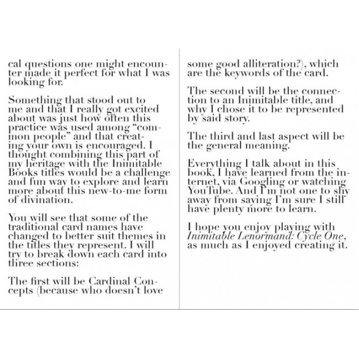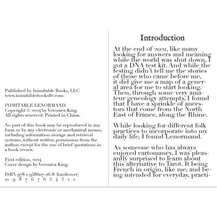 Author Veronica King pays homage to Inimitable Books' titles in this illustrated, 36-card Lenormand deck to help newbies and established fans of cartomancy alike explore divination. Let this deck and its guidebook, complete with simple card layouts, teach you a fun and easy alternative to Tarot.