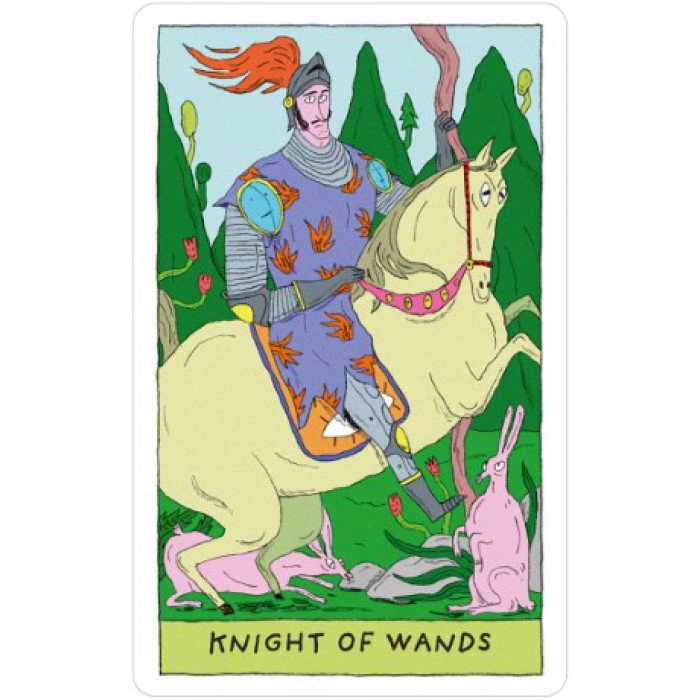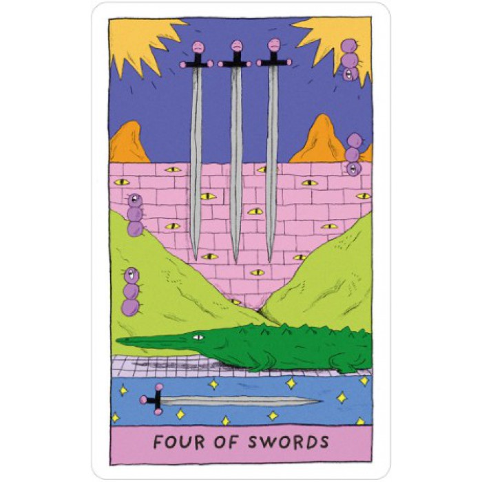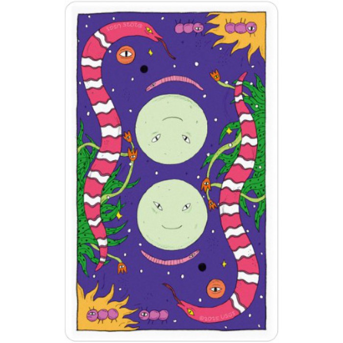 - Whimsical Artwork: Humorous, comic book style art; vibrant neon colors highlight tarot symbols and playful details